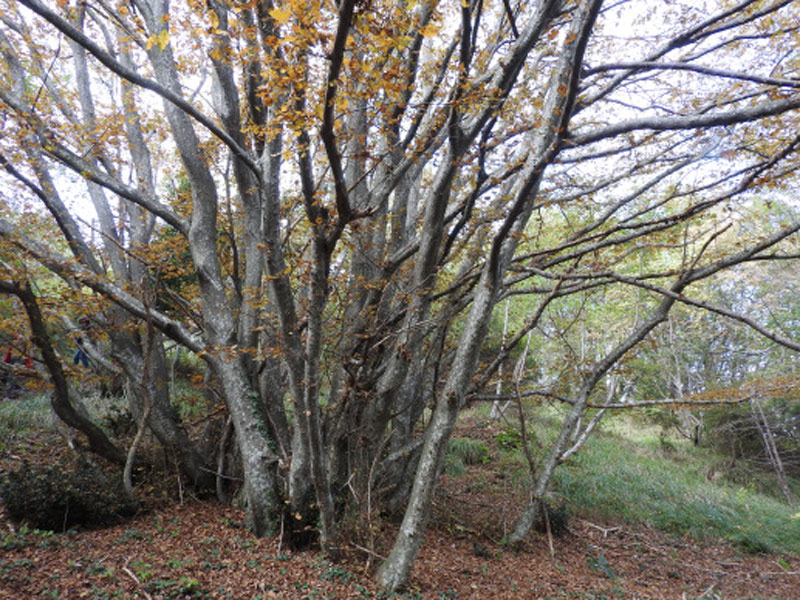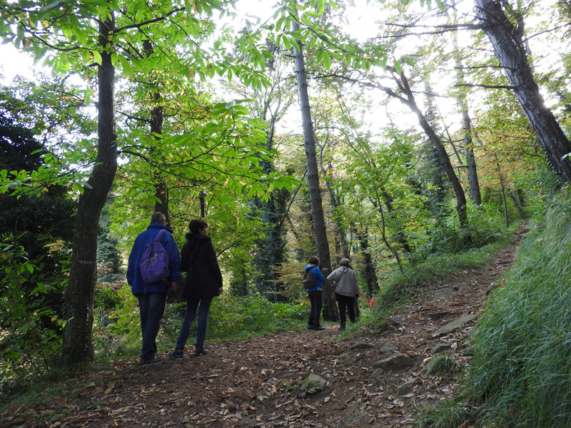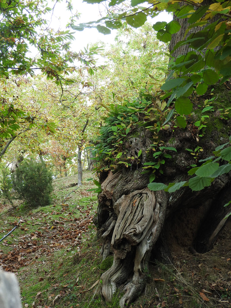 Finalmente arriviamo al castagneto Belloni, frequentatissimo da raccoglitori di castagne, famiglie con bambini ed escursionisti a piedi o in mountain bike; purtoppo le caldarroste sono quasi finite, ci accontentiamo di sgranocchiarne qualcuna riposandoci sotto i castagni. Alcuni alberi sono veramente monumentali, i tronchi contorti e scultorei.