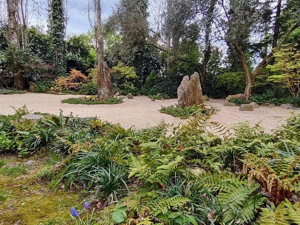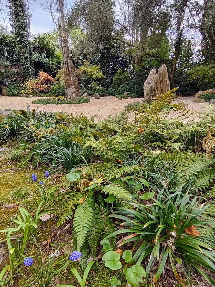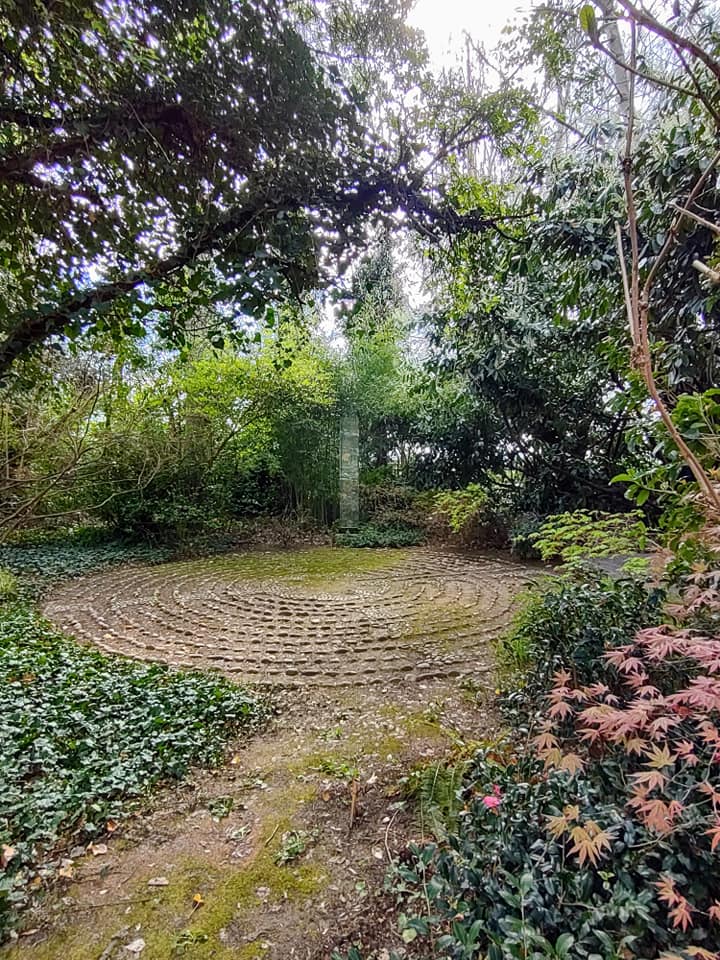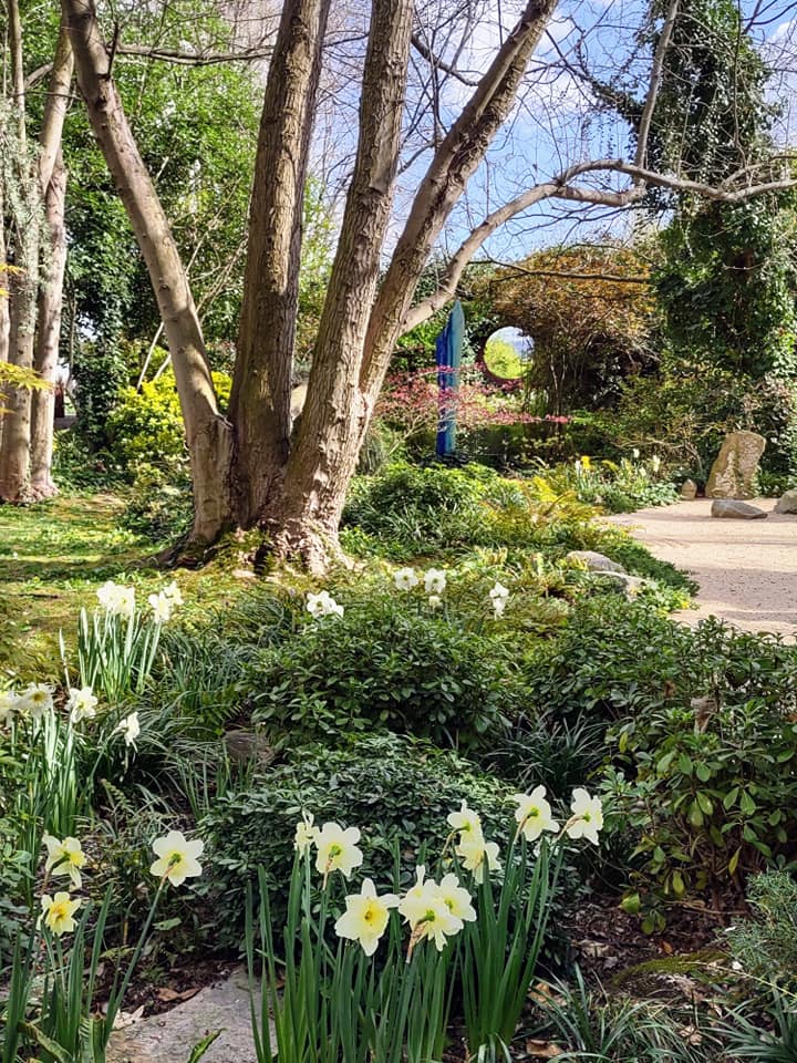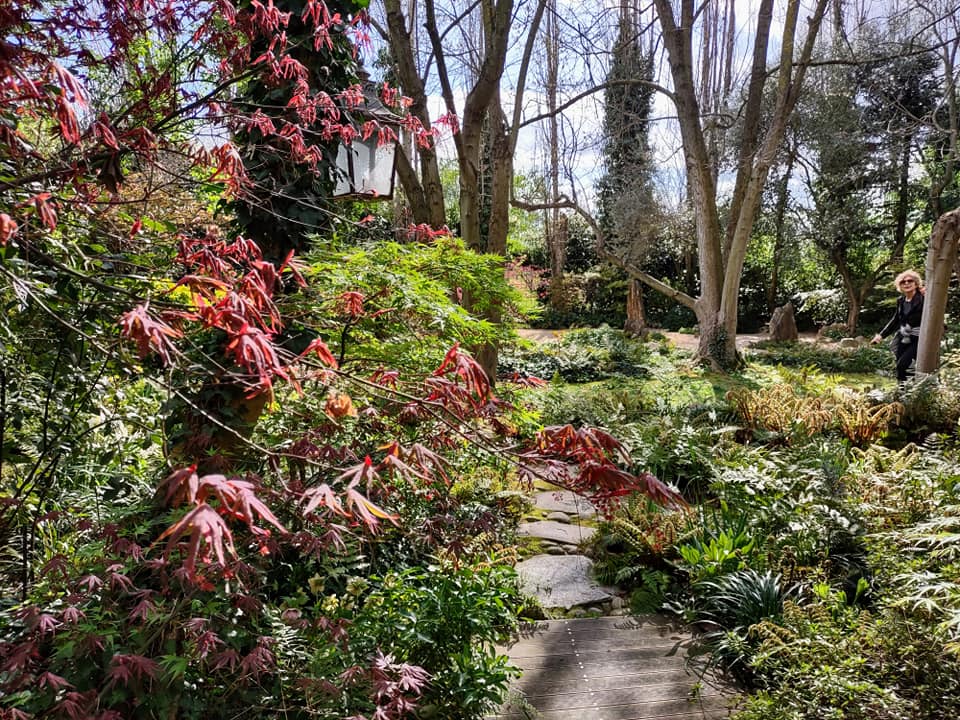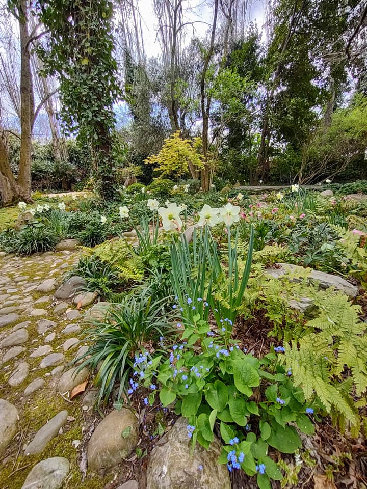È un giardino dal carattere un po’ misterioso, che si svela poco a poco, man mano che ci si inoltra nelle stanze verdi, legate l’una all’altra da altrettanti cannocchiali visivi che invitano alla scoperta, e a volte si aprono inaspettatamente sui campi verdi, a volte inquadrano una stele di vetro o altre installazioni create dalla proprietaria. All’ombra dei grandi alberi si sviluppa un ricchissimo sottobosco, popolato da Felci, Epimedium, Carex, Liriope, Brunnere e in questa stagione da una bella fioritura di Narcisi. Non manca un piccolo biolago, circondato da Iris pseudoacorus ed altre piante amanti dell’umidità, tra cui una Osmunda regalis che in questi giorni sta srotolando i suoi regali pastorali. Nella parte centrale si apre un grande spazio in cui è stato realizzato un Karesansui, o giardino giapponese di ghiaia, e un labirinto in ciottoli di fiume, che riproduce in scala ridotta quello della cattedrale di Chartres.