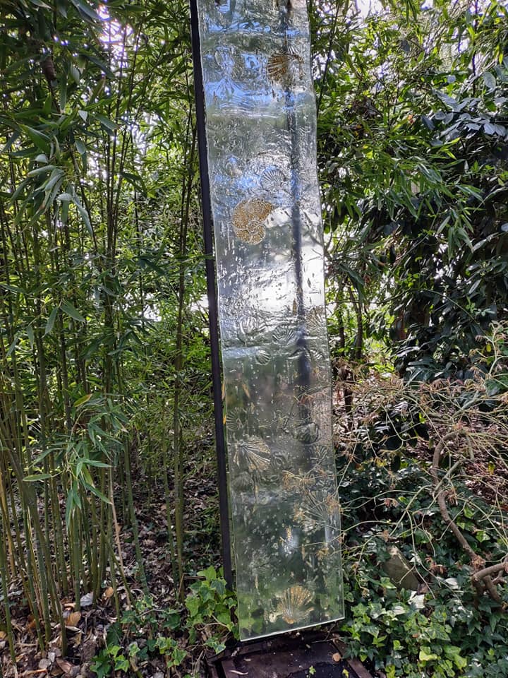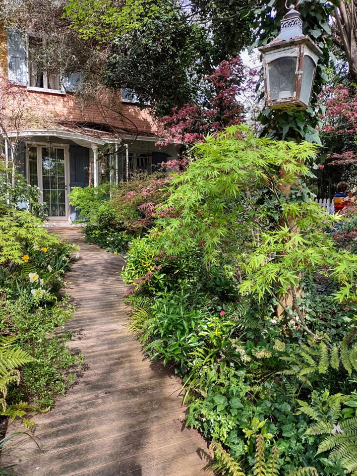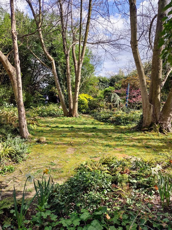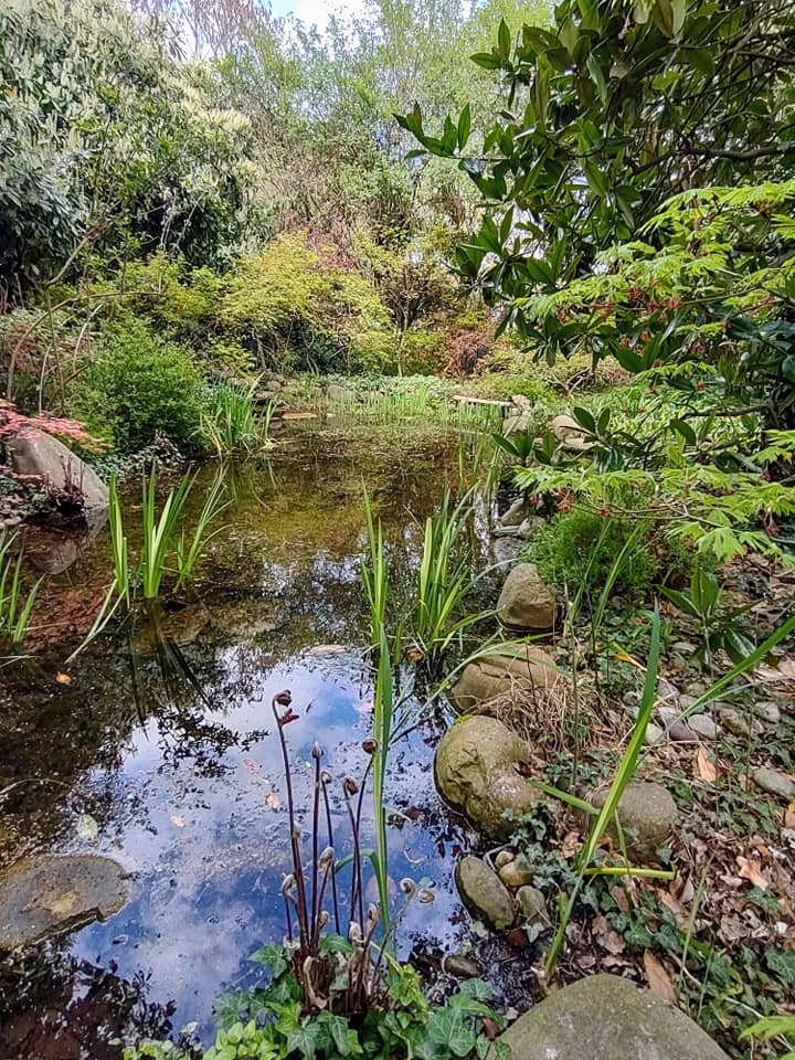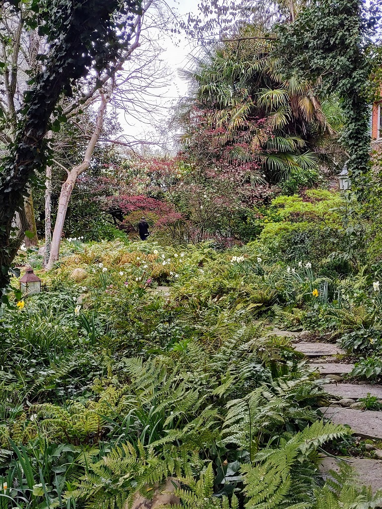 È un giardino dal carattere un po’ misterioso, che si svela poco a poco, man mano che ci si inoltra nelle stanze verdi, legate l’una all’altra da altrettanti cannocchiali visivi che invitano alla scoperta, e a volte si aprono inaspettatamente sui campi verdi, a volte inquadrano una stele di vetro o altre installazioni create dalla proprietaria. All’ombra dei grandi alberi si sviluppa un ricchissimo sottobosco, popolato da Felci, Epimedium, Carex, Liriope, Brunnere e in questa stagione da una bella fioritura di Narcisi. Non manca un piccolo biolago, circondato da Iris pseudoacorus ed altre piante amanti dell’umidità, tra cui una Osmunda regalis che in questi giorni sta srotolando i suoi regali pastorali. Nella parte centrale si apre un grande spazio in cui è stato realizzato un Karesansui, o giardino giapponese di ghiaia, e un labirinto in ciottoli di fiume, che riproduce in scala ridotta quello della cattedrale di Chartres.
