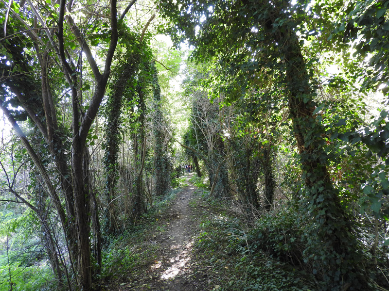 In alcuni punti si passa sotto un tunnel verde scuro, con vegetazione molto fitta, rovi e liane di edera che pendono dagli alberi, mentre si sente lo scorrere delle acque e si passeggia costeggiando campi coltivati.