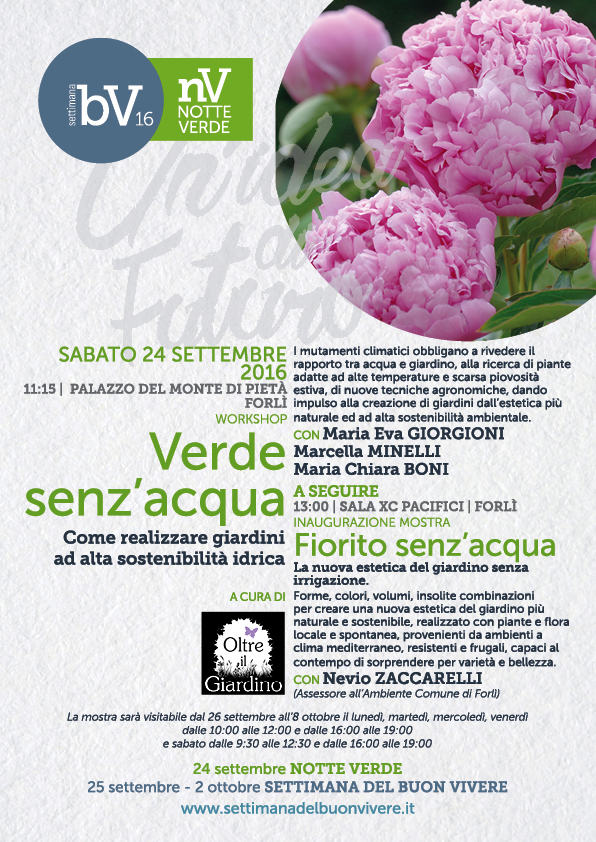 Nel 2016 la nostra Associazione ha partecipato alla kermesse organizzata dal Comune di Forlì nell’ambito del progetto ‘Romagna Terra del Buon Vivere’ – patrocinato dalla Regione Emilia-Romagna – con una mostra fotografica ed una conferenza sul tema del giardino arido, essendo l’acqua e l’uso responsabile delle risorse idriche il tema prescelto dalla manifestazione.